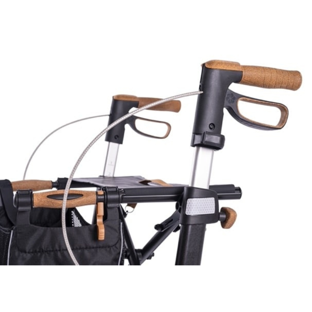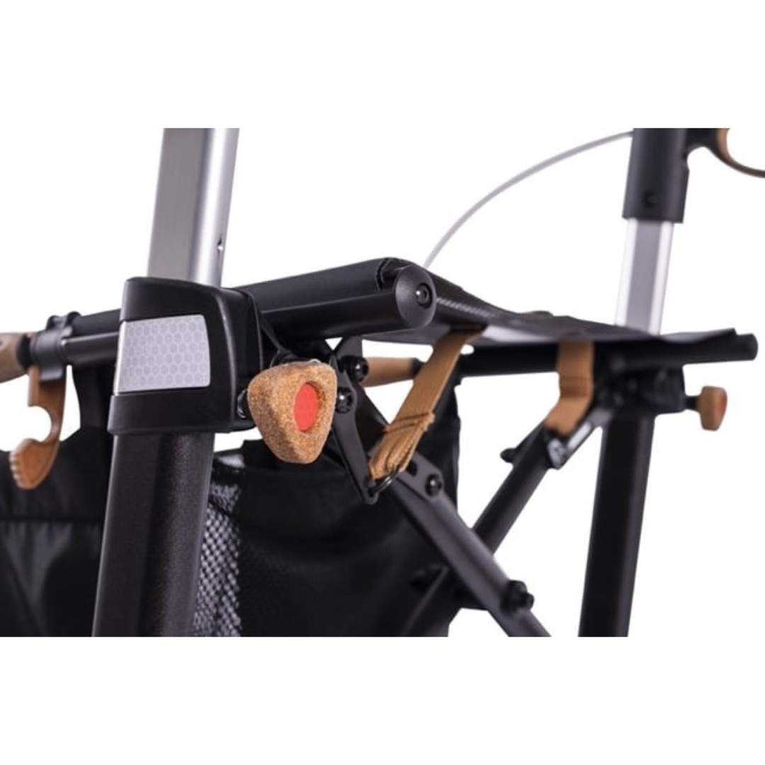 De ergonomische handgrepen van kurk TPE bieden niet alleen extra grip, maar werken ook schokabsorberend en warmte-isolerend. Dit zorgt voor een comfortabele ervaring, zelfs bij langdurig gebruik. Daarnaast is de rollator voorzien van meer dan 30 reflectoren, zodat u goed zichtbaar bent in het donker of bij schemering. Speciale antislipkussens op de kantelhulp zorgen ervoor dat uw schoen niet wegglijdt wanneer u een stoepje wilt nemen.