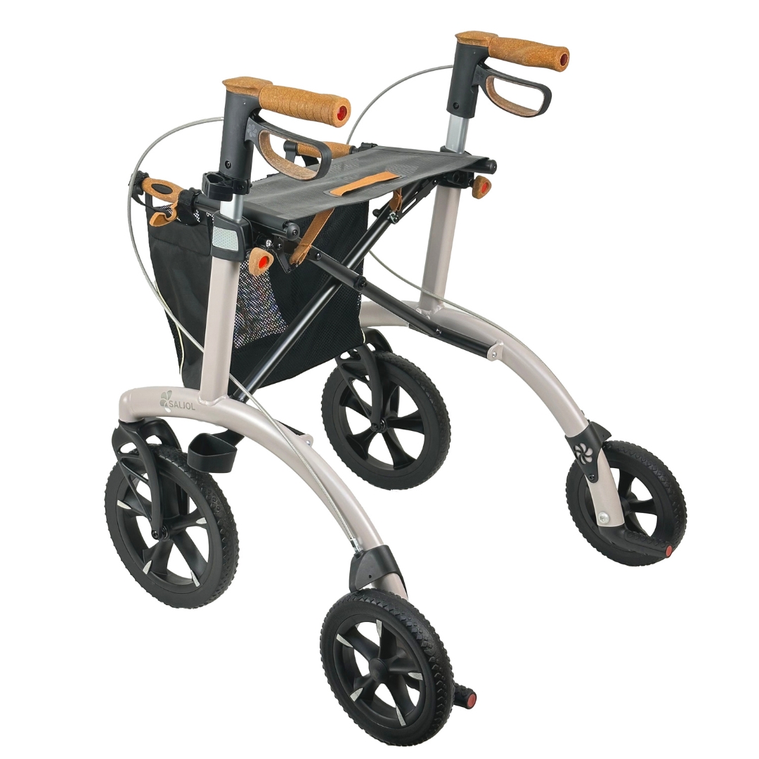 De Saljol Allround Rollator is een lichtgewicht en stabiele rollator van slechts 6,4 kg, ontworpen voor comfortabel gebruik in de stad én op ruw terrein. Dankzij de grote schokabsorberende all-terrain banden, ergonomische kurkhandgrepen en het optioneel éénhandige remsysteem biedt deze rollator maximale veiligheid, wendbaarheid en comfort voor actieve gebruikers, zowel binnen als buiten.