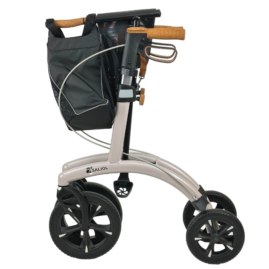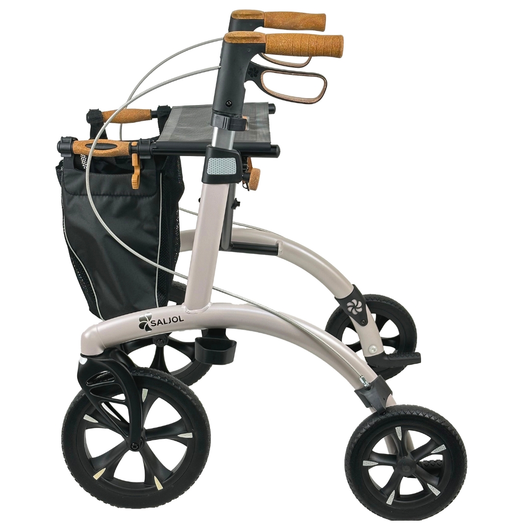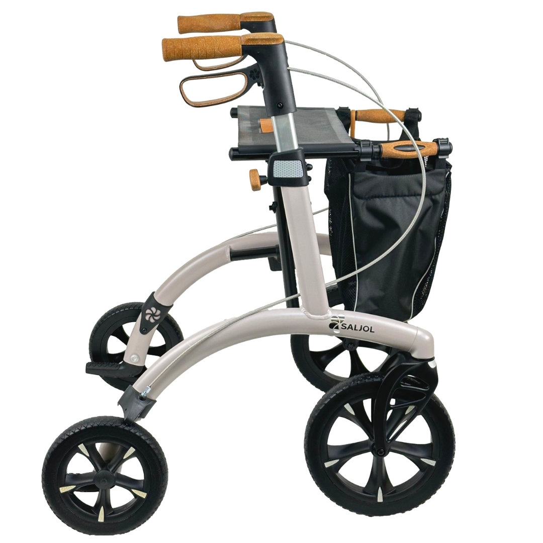 De Saljol Allround rollator combineert het beste van twee werelden: wendbaarheid in de stad en stabiliteit op ruw terrein. Het innovatieve ontwerp zorgt ervoor dat u soepel kunt manoeuvreren in smalle winkelpaden, maar ook gemakkelijk over grindpaden of hobbelige wegen kunt rijden. Dankzij het lichtgewicht aluminium frame is de rollator eenvoudig op te tillen, bijvoorbeeld wanneer een roltrap of lift niet werkt.