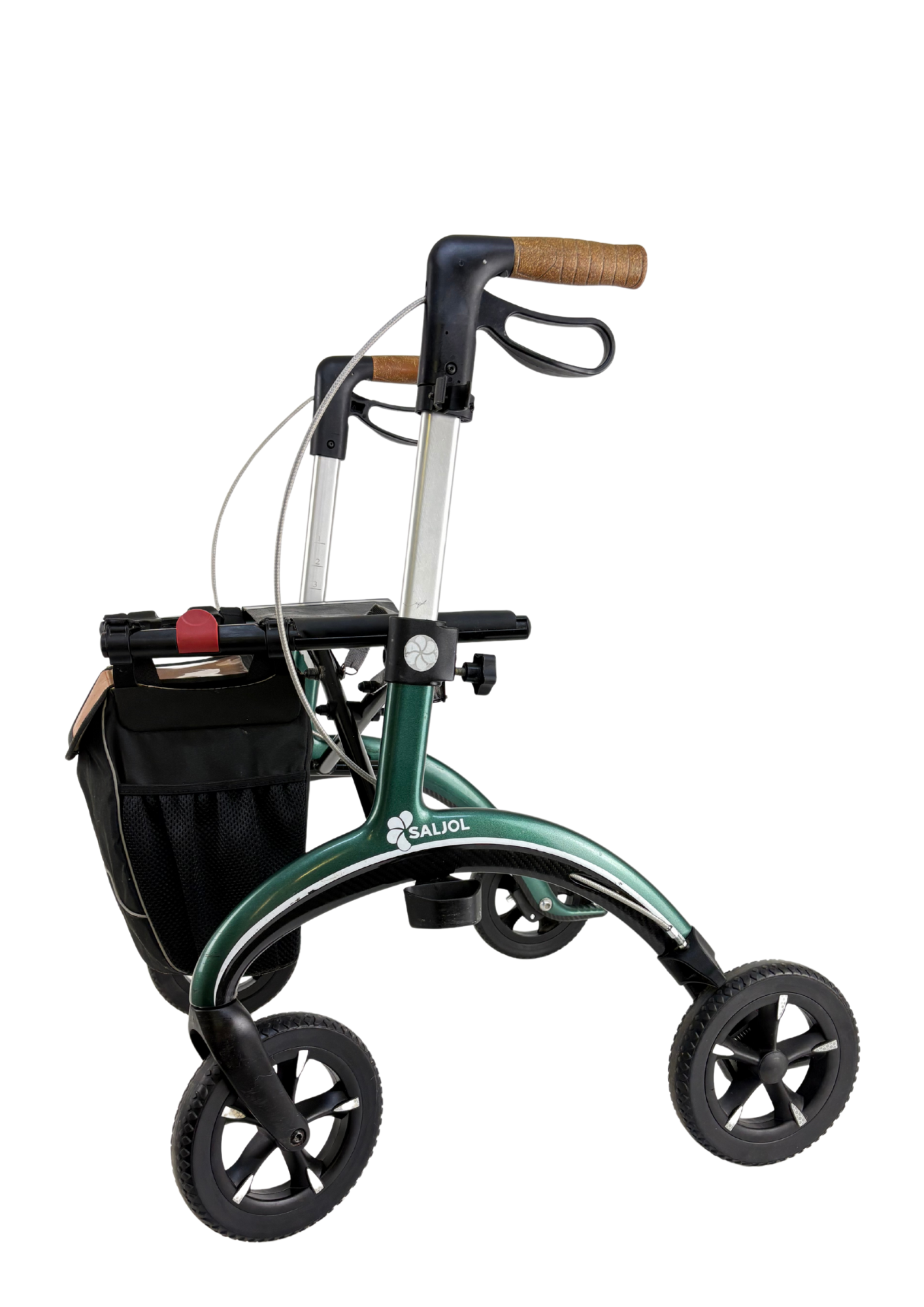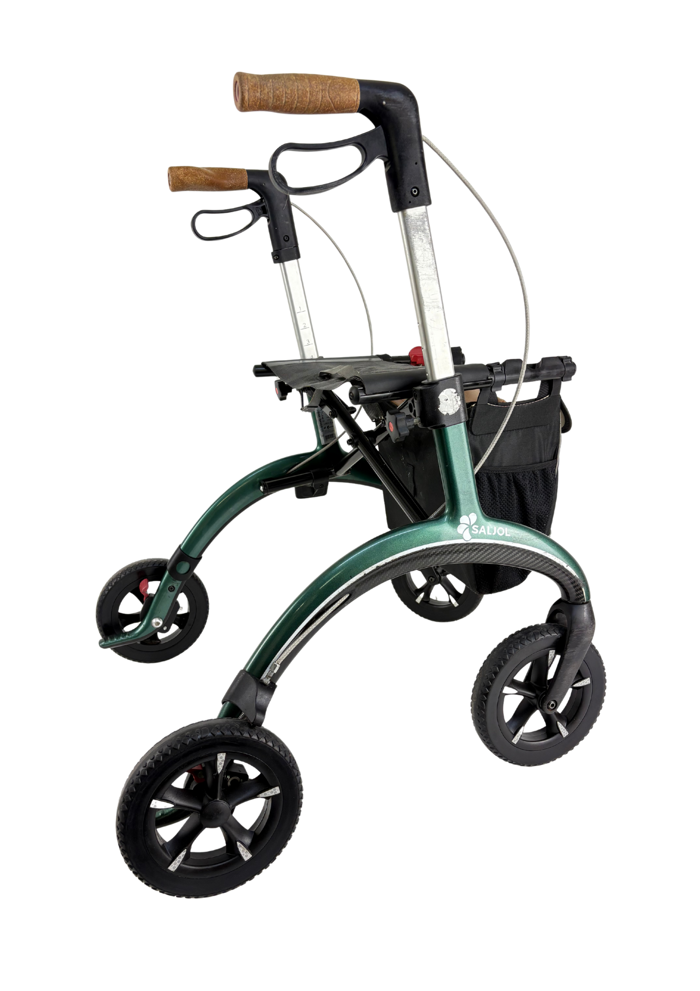 Gebruikte Saljol Carbon rollator in de kleur British Racing Green, bouwjaar 2022.