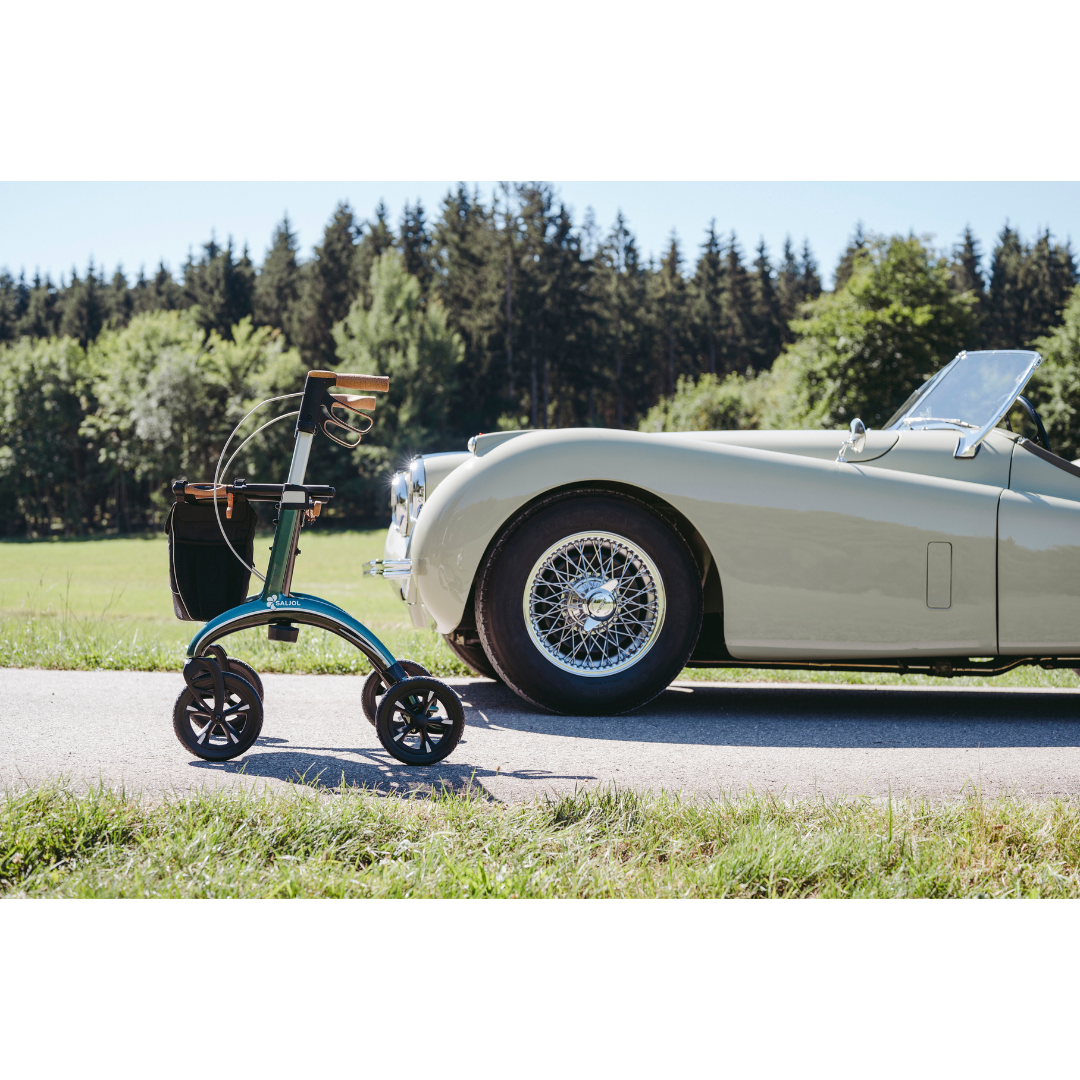 De Saljol rollator maakt zowel bergafwaarts als bergop rijden veiliger. Bij het afdalen remt de versnellingspook op de achterwielen de rollator af, vergelijkbaar met een motorrem in een auto, zodat een deel van de belasting wordt overgenomen en de rollator niet oncontroleerbaar versnelt. Bij het bergop rijden zorgt het lichte gewicht van 6 kg en het schakelsysteem ervoor dat de rollator stabiel blijft en niet achteruit rolt. De geïntegreerde sleeprem kan eenvoudig met de voet worden geactiveerd, deactiveert en aangepast worden.