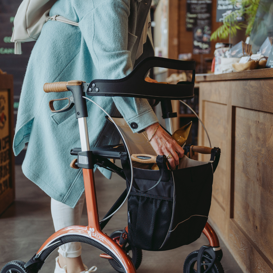 De Saljol Carbon Rollator CR54 wordt standaard geleverd met een stijlvolle magneetsluiting-tas, een handige stokhouder, een vergrendelingshaak, geïntegreerde sleepremmen en een uitgebreide instructiehandleiding.