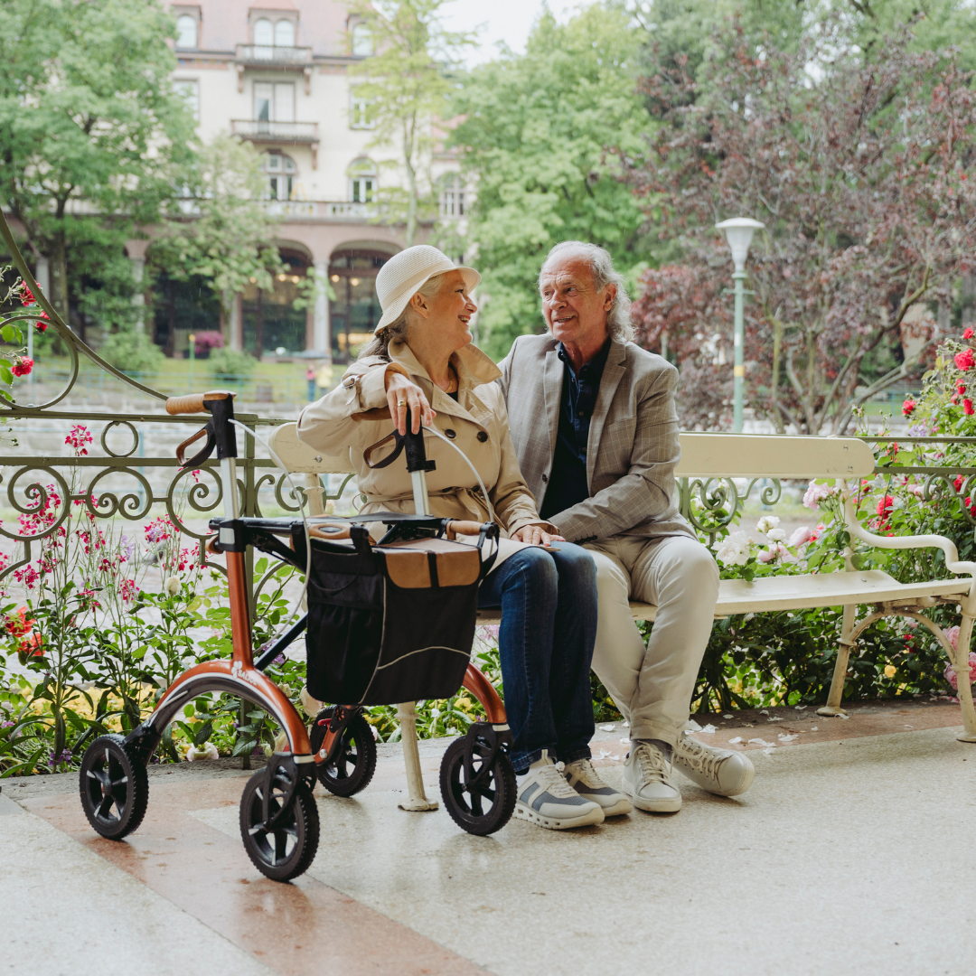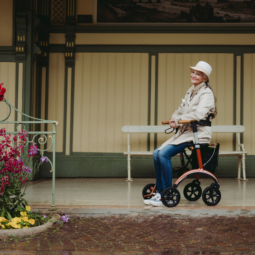Dankzij de schokdempende all-terrain banden en ergonomische kurkhandgrepen geniet u van maximaal comfort, zelfs op oneffen terrein. Met een inklapbaar design en een breedte van slechts 22 cm in gevouwen toestand is de Carbon Rollator eenvoudig te vervoeren en past hij in vrijwel elke auto. De meegeleverde magneetsluiting-tas biedt voldoende opbergruimte en is eenvoudig toegankelijk. Of u nu over asfalt, onverharde paden of door drukke stadsstraten loopt, de stille en soepele wielen zorgen voor een prettige rijervaring. Bovendien zorgen de vele reflectoren op het frame en de wielen voor extra veiligheid in het donker.