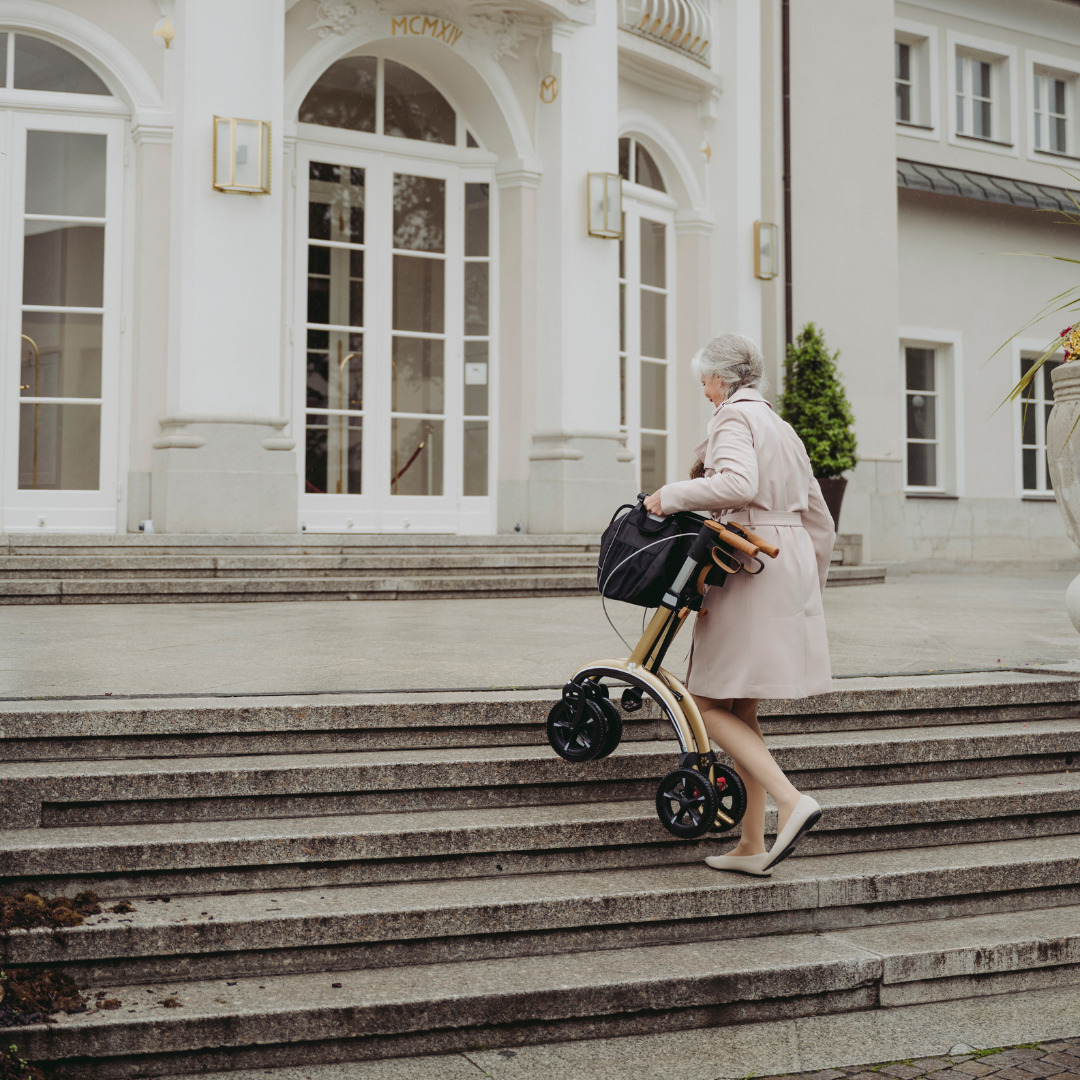Dankzij de schokdempende all-terrain banden en ergonomische kurkhandgrepen geniet u van maximaal comfort, zelfs op oneffen terrein. Met een inklapbaar design en een breedte van slechts 22 cm in gevouwen toestand is de Carbon Rollator eenvoudig te vervoeren en past hij in vrijwel elke auto. De meegeleverde magneetsluiting-tas biedt voldoende opbergruimte en is eenvoudig toegankelijk. Of u nu over asfalt, onverharde paden of door drukke stadsstraten loopt, de stille en soepele wielen zorgen voor een prettige rijervaring. Bovendien zorgen de vele reflectoren op het frame en de wielen voor extra veiligheid in het donker.