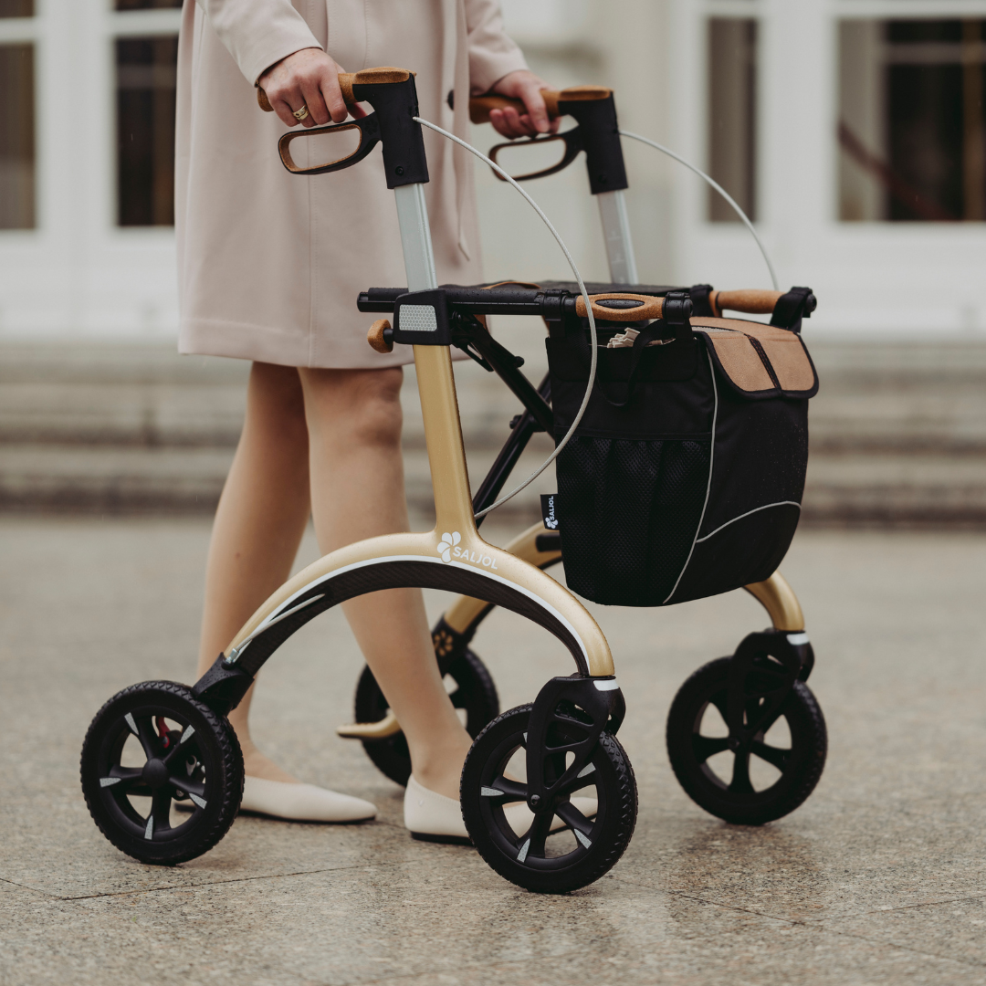 De Saljol rollator maakt zowel bergafwaarts als bergop rijden veiliger. Bij het afdalen remt de versnellingspook op de achterwielen de rollator af, vergelijkbaar met een motorrem in een auto, zodat een deel van de belasting wordt overgenomen en de rollator niet oncontroleerbaar versnelt. Bij het bergop rijden zorgt het lichte gewicht van 6 kg en het schakelsysteem ervoor dat de rollator stabiel blijft en niet achteruit rolt. De geïntegreerde sleeprem kan eenvoudig met de voet worden geactiveerd, deactiveert en aangepast worden.