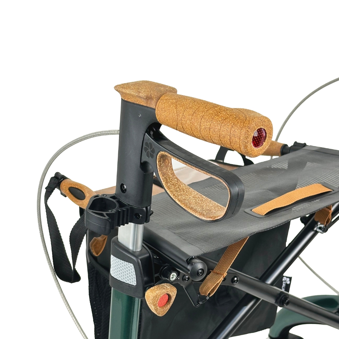 De Saljol Carbon rollator is ontworpen met gebruiksgemak en comfort in gedachten. De zachte, schokabsorberende banden en ergonomische kurken handgrepen zorgen voor een soepele en comfortabele rit, zelfs op ruwe ondergronden. Dankzij de versnellingspook biedt de rollator extra remkracht bij nat weer of steile hellingen, vergelijkbaar met een motorrem in een auto.