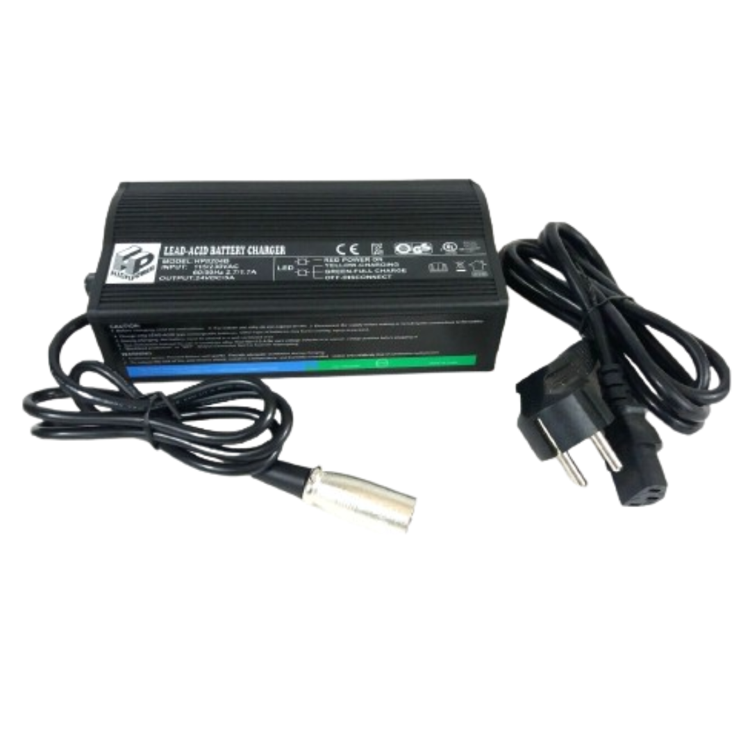 Originele Merits 24V 5Ah acculader (model HP8204B), geschikt voor bijna alle scootmobielen met 3-pins XLR aansluiting.