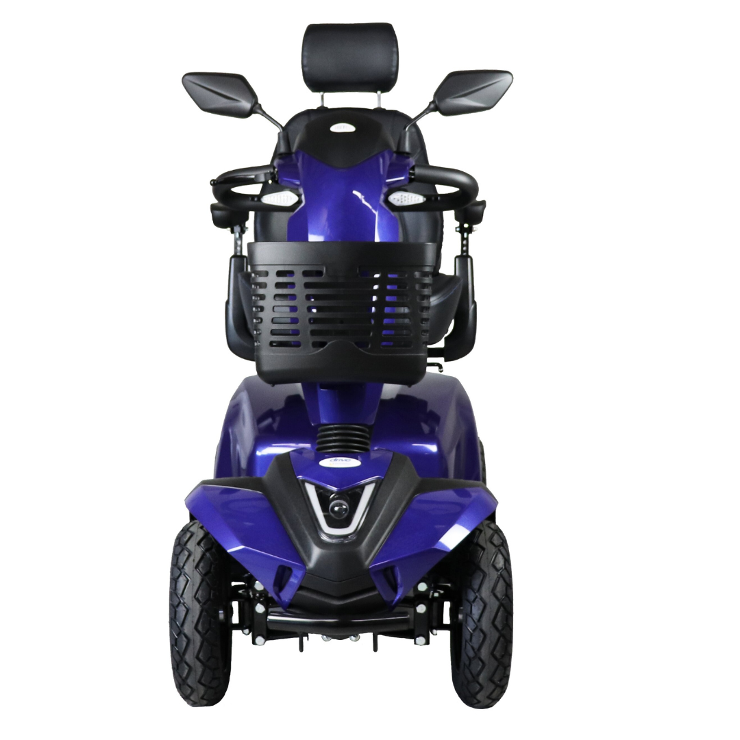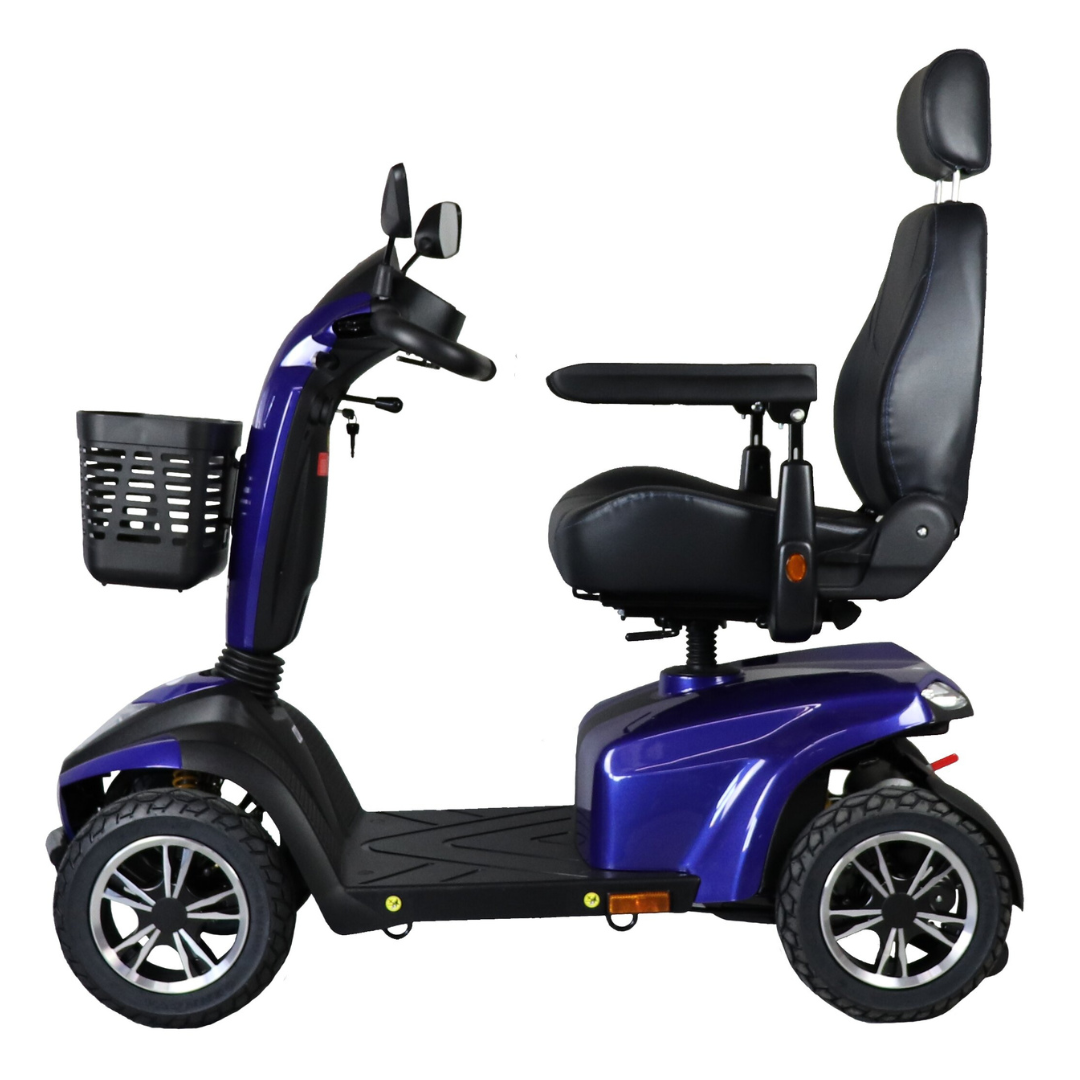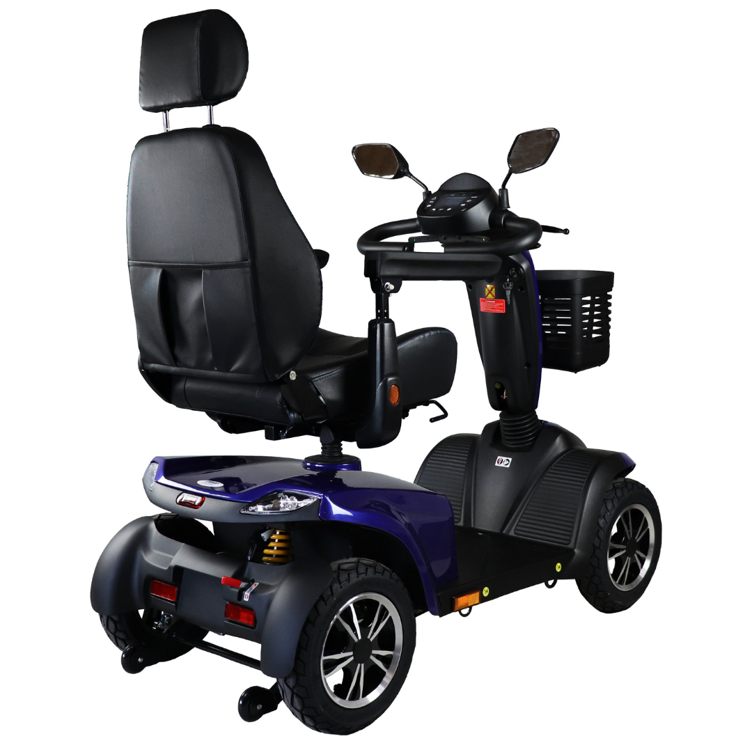 De Drive ST5D is een sportieve 4-wiel scootmobiel met 15 km/u topsnelheid, luxe kapiteinsstoel en volledige vering. Maximale stabiliteit, comfort en moderne uitstraling in het blauw.