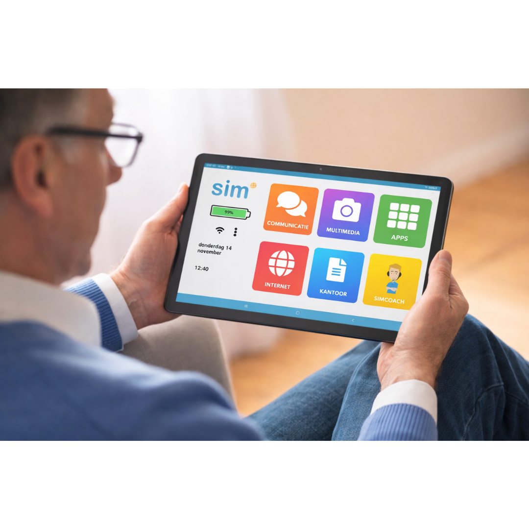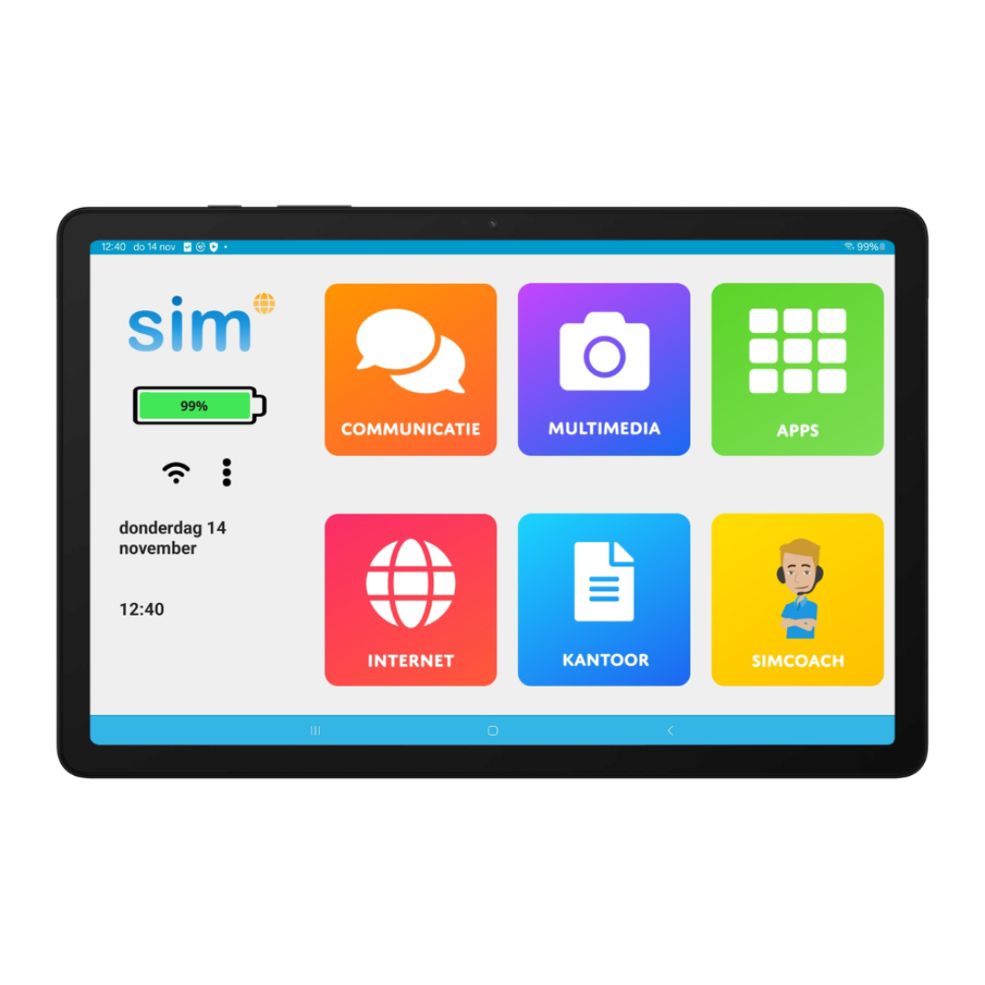 Gebruiksvriendelijke senioren tablet met groot 11 inch scherm, overzichtelijk SimOS besturingssysteem en 1 jaar gratis SimCoach ondersteuning. Ideaal voor eenvoudig internetten, e-mailen en beeldbellen via wifi.