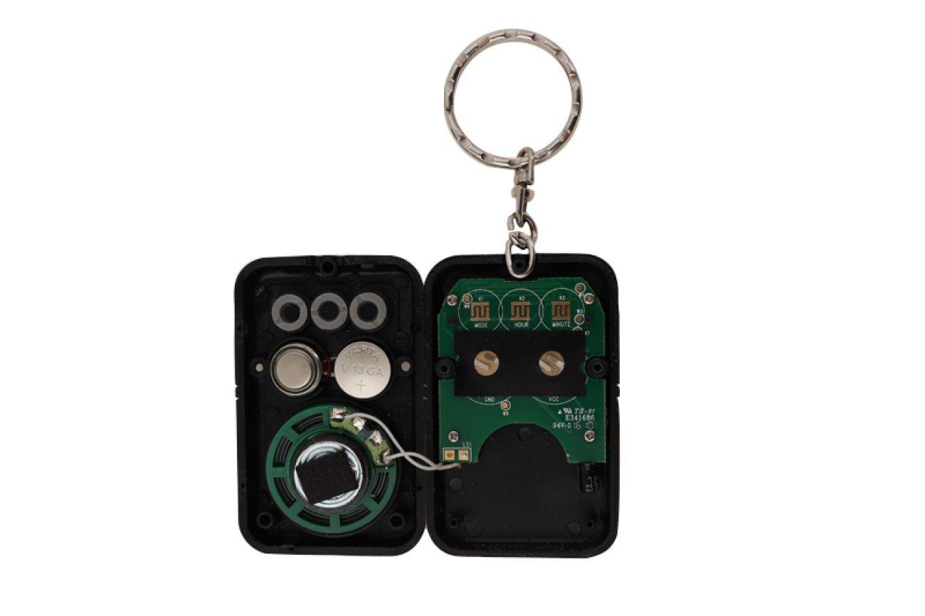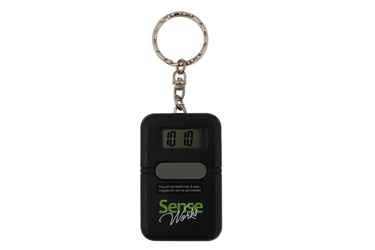 SenseWorks Nederlandssprekende reiswekker in de vorm van een sleutelhanger. Rechthoekig model met klein digitaal display. Gemaakt van kunststof. Er is keuze voor tijd- en alarmuitspraak in 12 of 24 uursklok bijvoorbeeld: "De tijd is vijf over twaalf in de middag". Functies zoals tijd, alarm, sluimer- en uurfunctie worden geheel uitgesproken.