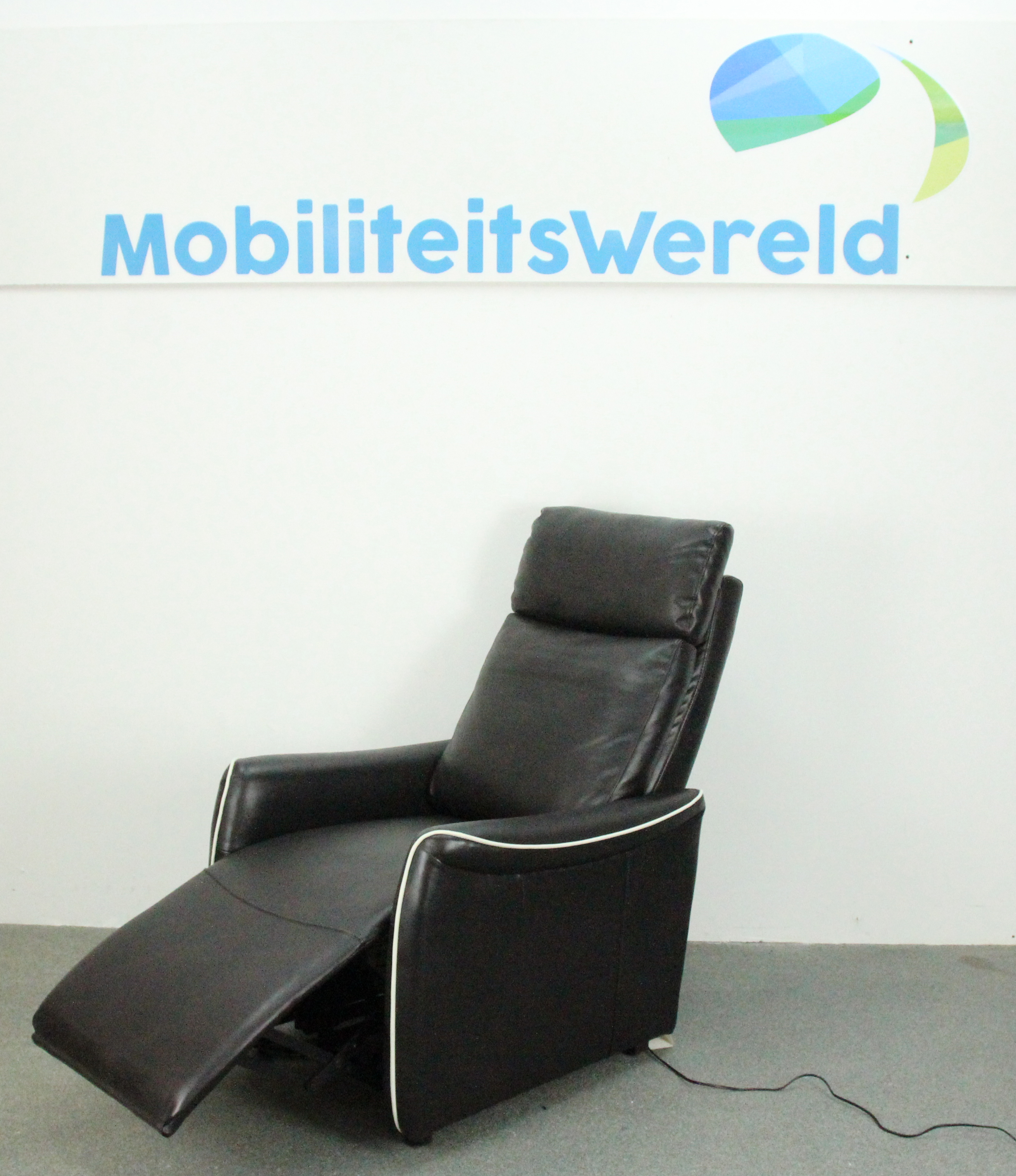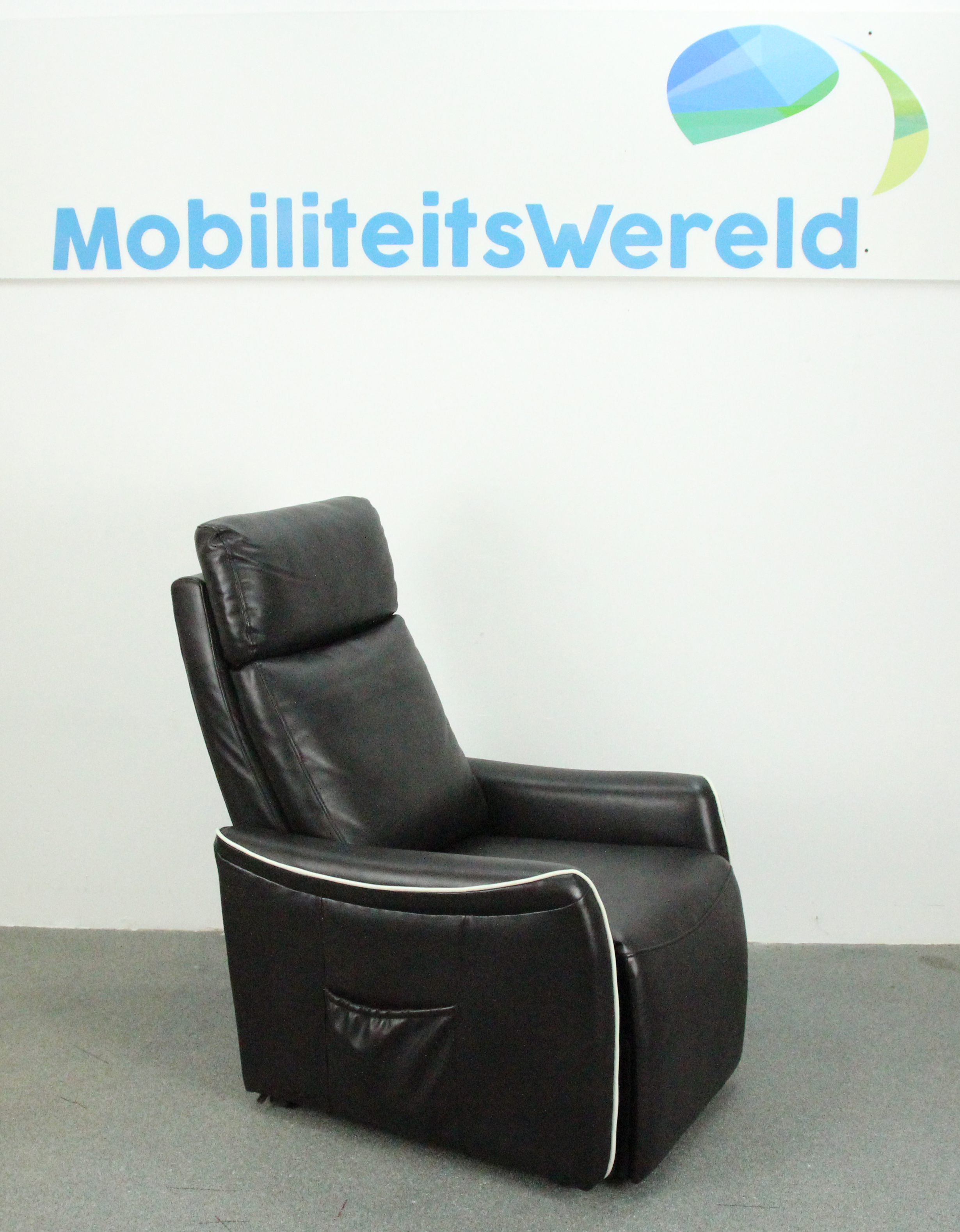 Dit model Staop stoel is leverbaar in zwart kunst leer afgewerkt met een mooie witte bies. En is voorzien van 2 motoren.