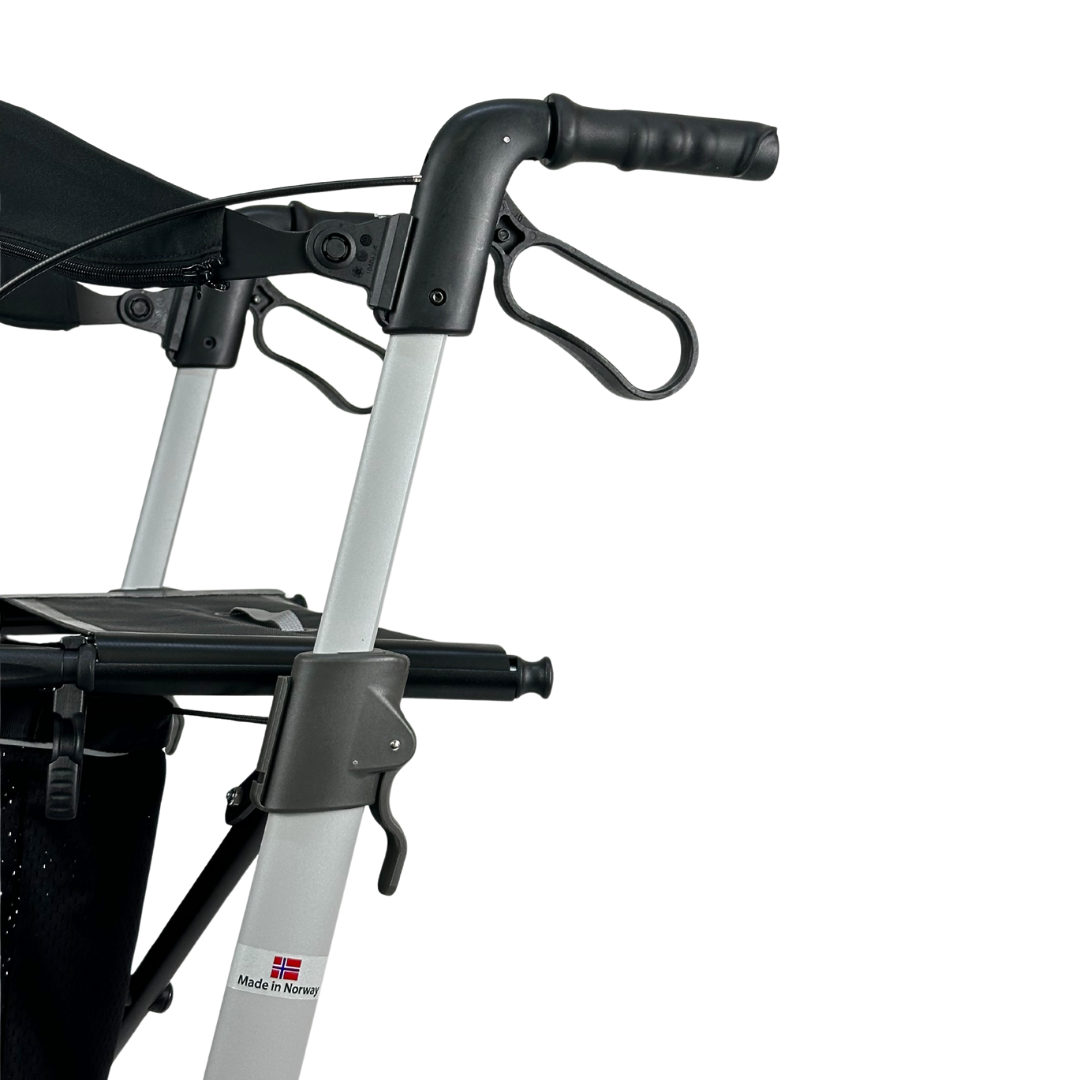 De speciaal ontwikkelde ergonomische handgrepen liggen comfortabel in de hand en bieden uitstekende controle, zelfs tijdens langere wandelingen. Dankzij de stabiele grip loopt de rollator uiterst soepel en zelfverzekerd met u mee, zodat u iedere dag ontspannen op pad kunt. Daarnaast wordt de rollator geleverd met een comfortabele rugband, zodat u onderweg veilig en ontspannen kunt uitrusten.