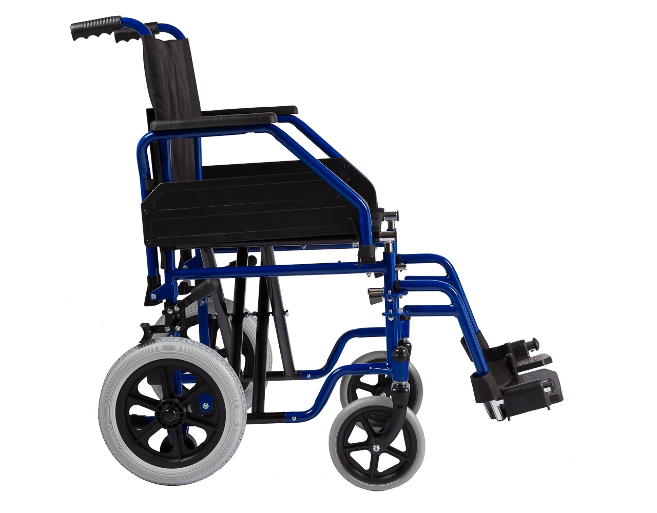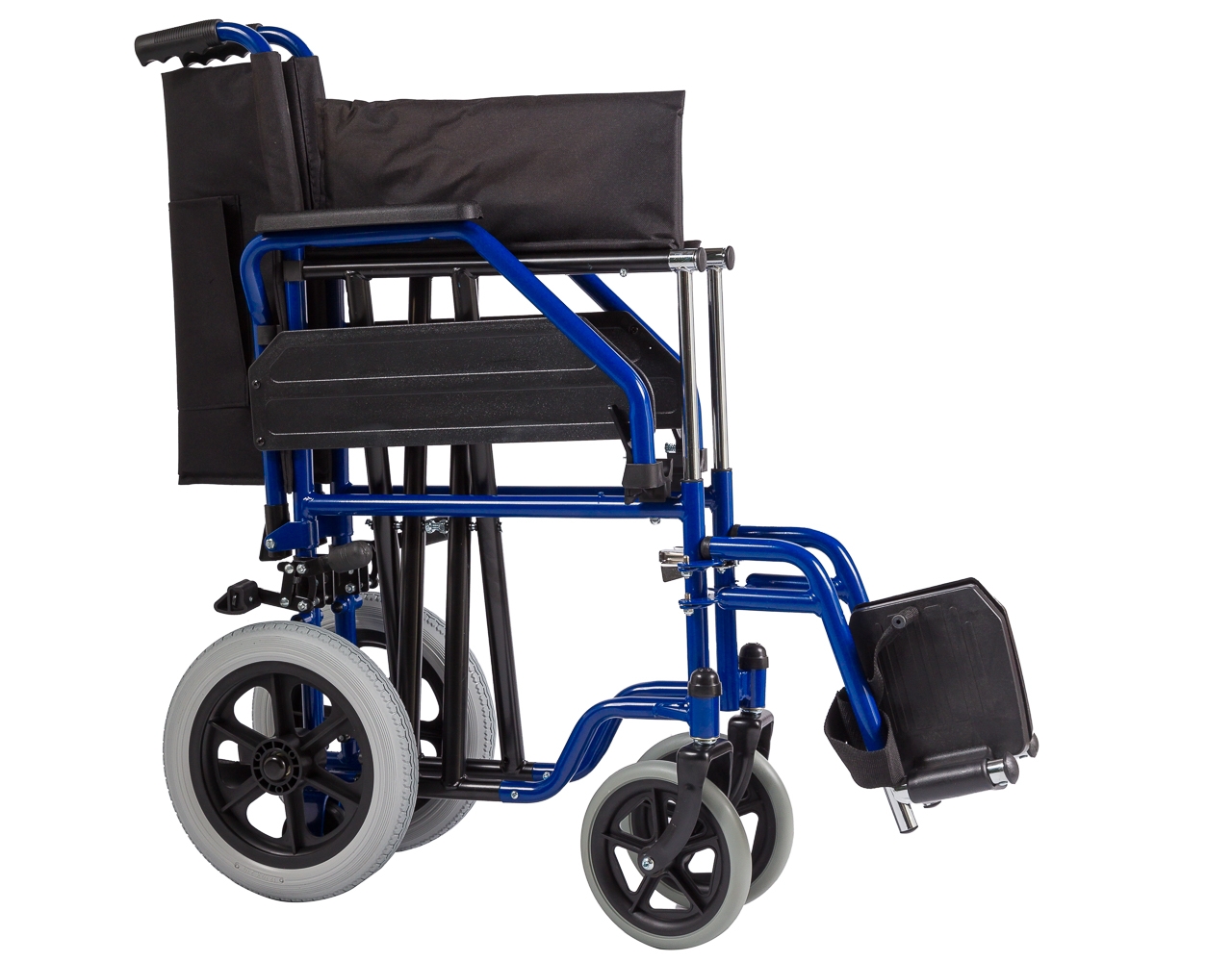 Dit is een eenvoudige opvouwbare transportrolstoel. Licht in gewicht en makkelijk in gebruik. Het frame is van staal in de kleur blauw. De bekleding is van zwarte nylon.