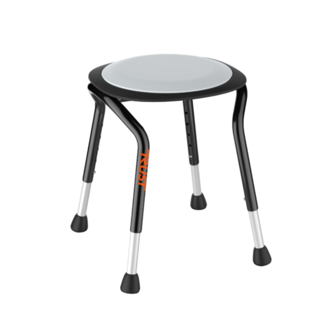 De Let’s Frisbee is geschikt voor vrijwel iedereen dankzij de in hoogte verstelbare poten. Met het eenvoudige druksysteem stel je de kruk moeiteloos in op de juiste hoogte. Dit systeem zorgt ervoor dat de kruk stevig op zijn plek blijft staan zodra de gewenste hoogte is ingesteld. De kruk kan worden versteld van 45 cm tot 53 cm, zodat hij perfect aansluit op de behoeften van de gebruiker.