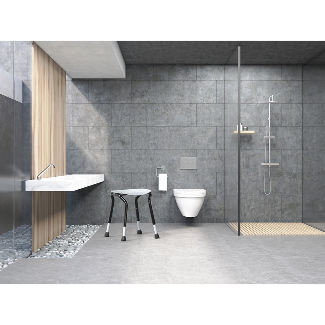 De Let’s Shower douchekruk is geschikt voor iedereen, dankzij de verstelbare poten die eenvoudig op de gewenste hoogte kunnen worden ingesteld. Met een eenvoudige druk op de knop pas je de zithoogte aan tussen 45 cm en 53 cm, zodat je altijd op de juiste hoogte zit. Een ingebouwd beveiligingssysteem zorgt ervoor dat de kruk stabiel blijft staan, zonder dat je je zorgen hoeft te maken over veiligheid.