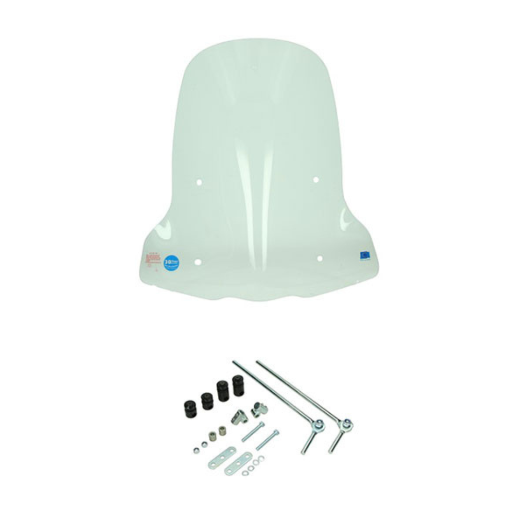 Universeel scootmobiel windscherm voor spiegelaansluiting. Transparant, stevig en beschermt tegen wind, regen en insecten. Te monteren en geschikt voor vrijwel alle modellen met spiegelbevestiging.