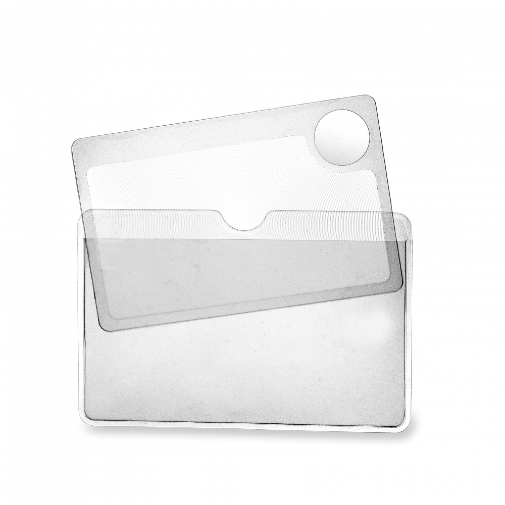 Handig klein vergrootglas in het formaat van een visitekaartje. Makkelijk mee te nemen in een portemonnee.