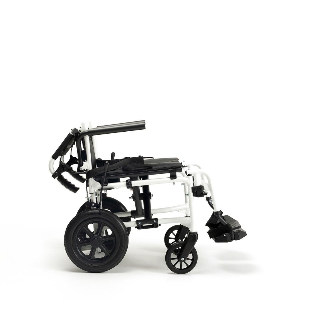 De Bobby is voorzien van ergonomische handvatten met een vaste hoogte. Hierbij zijn remmen gemonteerd op de 12,5″ achterwielen remmen. De gebruiker zelf kan de rem ook eenvoudig d.m.v. een remhendel op de rem plaatsen. De beensteunen zijn eenvoudig te monteren en ruim af te stellen voor de gebruiker, zodat hij of zij een goede zitpositie heeft. Het opvouwen van de Bobby transportrolstoel gaat zeer eenvoudig door de rugleuning dubbel te klappen, beensteunen af te nemen en met de lussen trekt u de rolstoel eenvoudig samen. Het wordt dan een compact pakketje van LxBxH – 68x26x75 cm met een handig handvat om de rolstoel aan op te tillen. Een zeer hoogwaardig product die leverbaar is in 2 zitbreedte maten.
