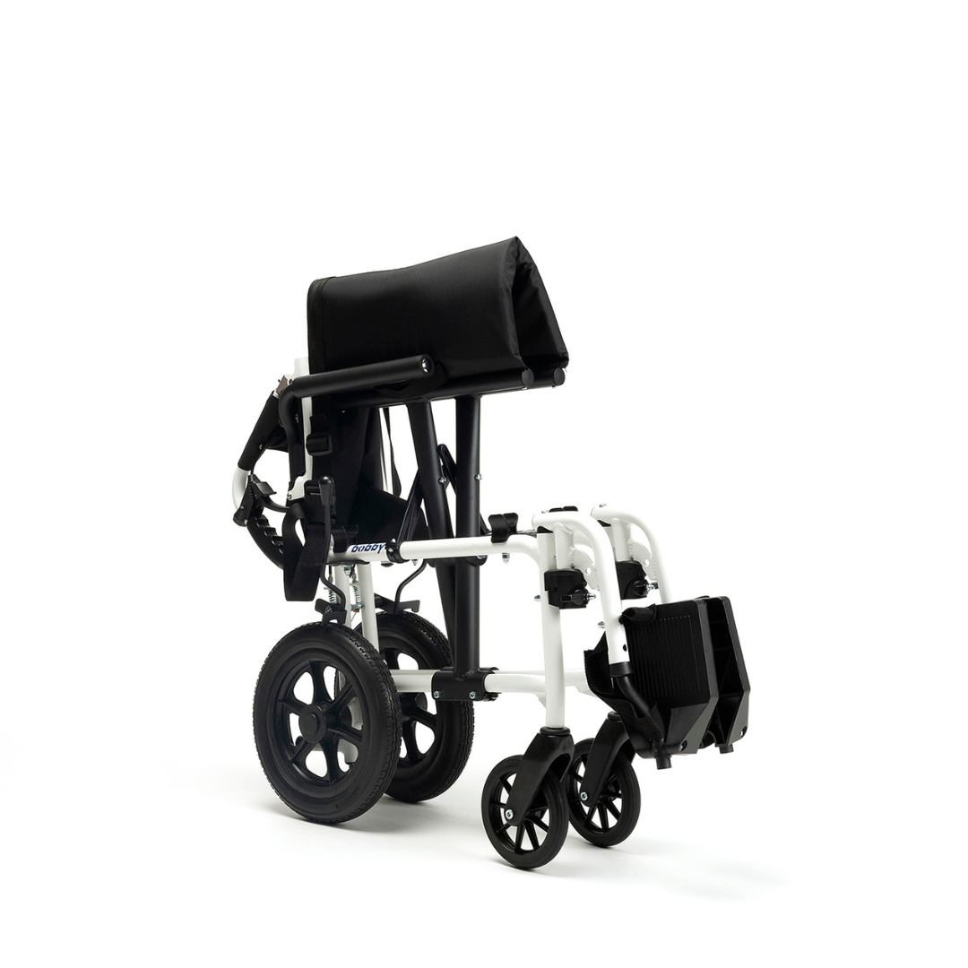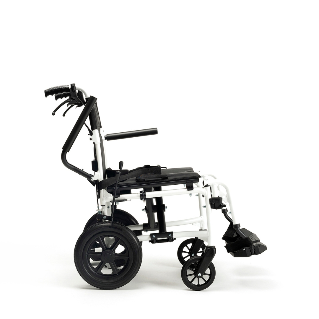 De Bobby is voorzien van ergonomische handvatten met een vaste hoogte. Hierbij zijn remmen gemonteerd op de 12,5″ achterwielen remmen. De gebruiker zelf kan de rem ook eenvoudig d.m.v. een remhendel op de rem plaatsen. De beensteunen zijn eenvoudig te monteren en ruim af te stellen voor de gebruiker, zodat hij of zij een goede zitpositie heeft. Het opvouwen van de Bobby transportrolstoel gaat zeer eenvoudig door de rugleuning dubbel te klappen, beensteunen af te nemen en met de lussen trekt u de rolstoel eenvoudig samen. Het wordt dan een compact pakketje van LxBxH – 68x26x75 cm met een handig handvat om de rolstoel aan op te tillen. Een zeer hoogwaardig product die leverbaar is in 2 zitbreedte maten.