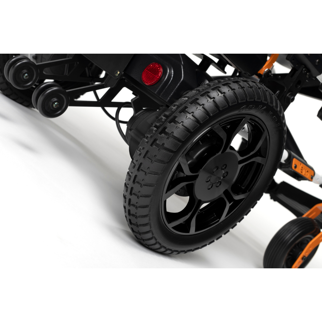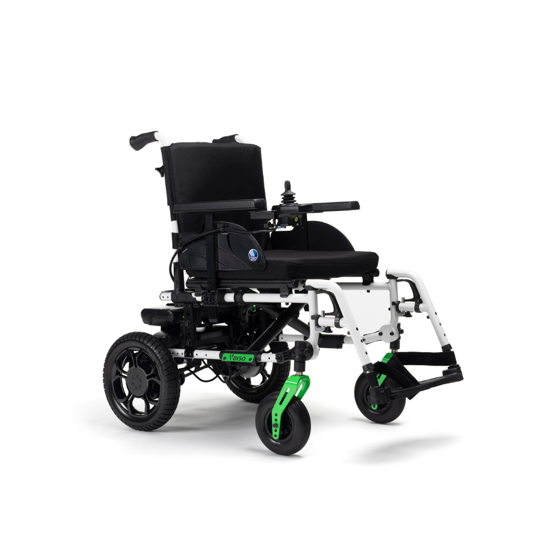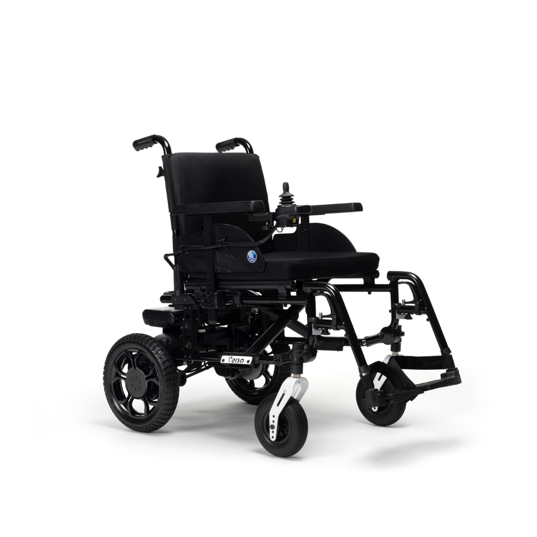 Met 2 x 200W motoren en 12" PU zwarte banden kan de Verso zich meten met anderen in zijn categorie. Een geweldige en duurzame keuze voor een elektrische rolstoel voor dagelijks gebruik.