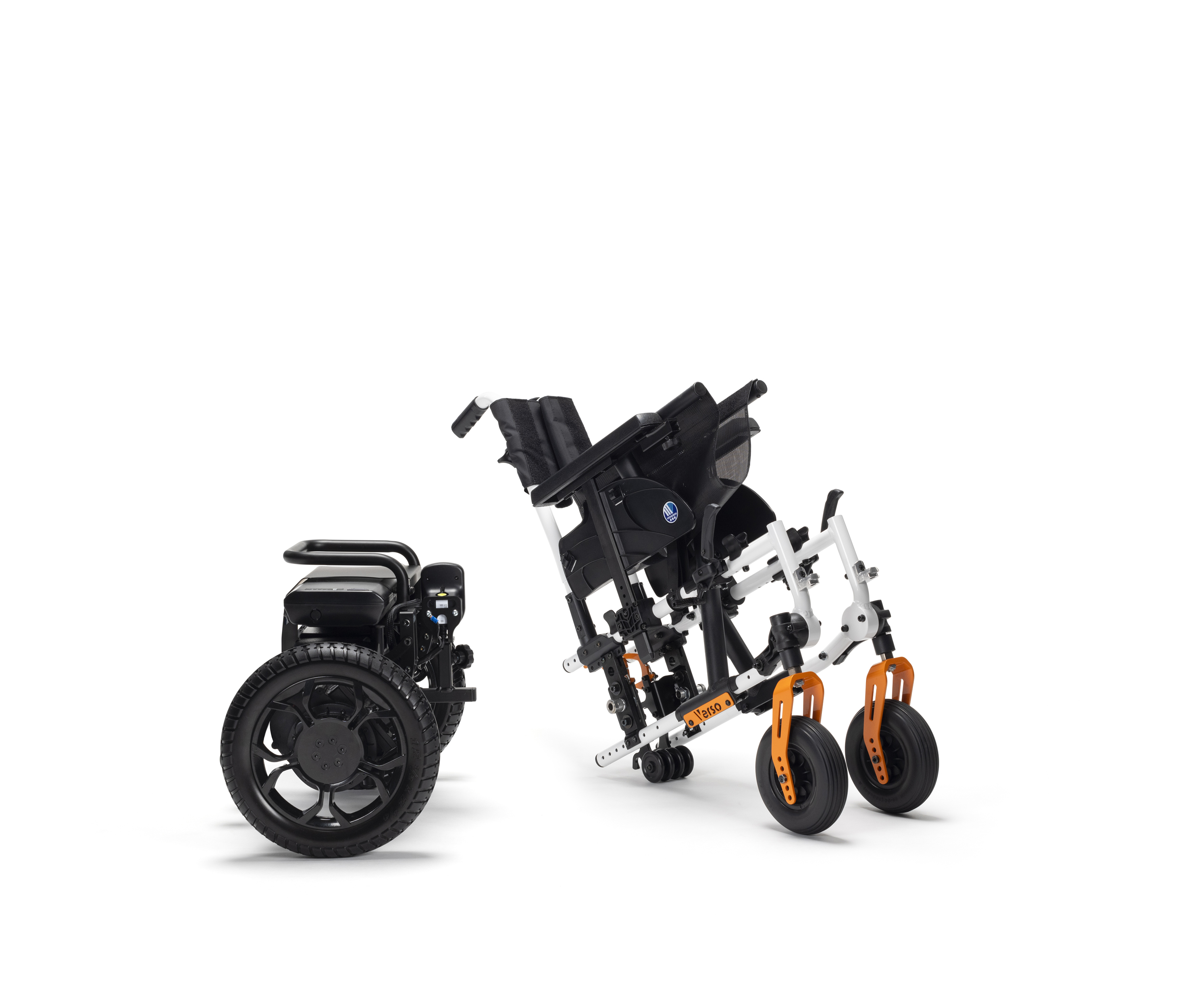Een unieke functie voor de Verso is het afneembare motor- en accublok. Maak je rolstoel los van de accu en het wielblok om hem gemakkelijk op te bergen en te vervoeren. Zowel het frame als het "aangedreven deel" van Verso hebben een extra wiel om ervoor te zorgen dat er geen onderdelen beschadigd kunnen raken door het loskoppelen. Ze zorgen ook voor eenvoudig manoeuvreren.