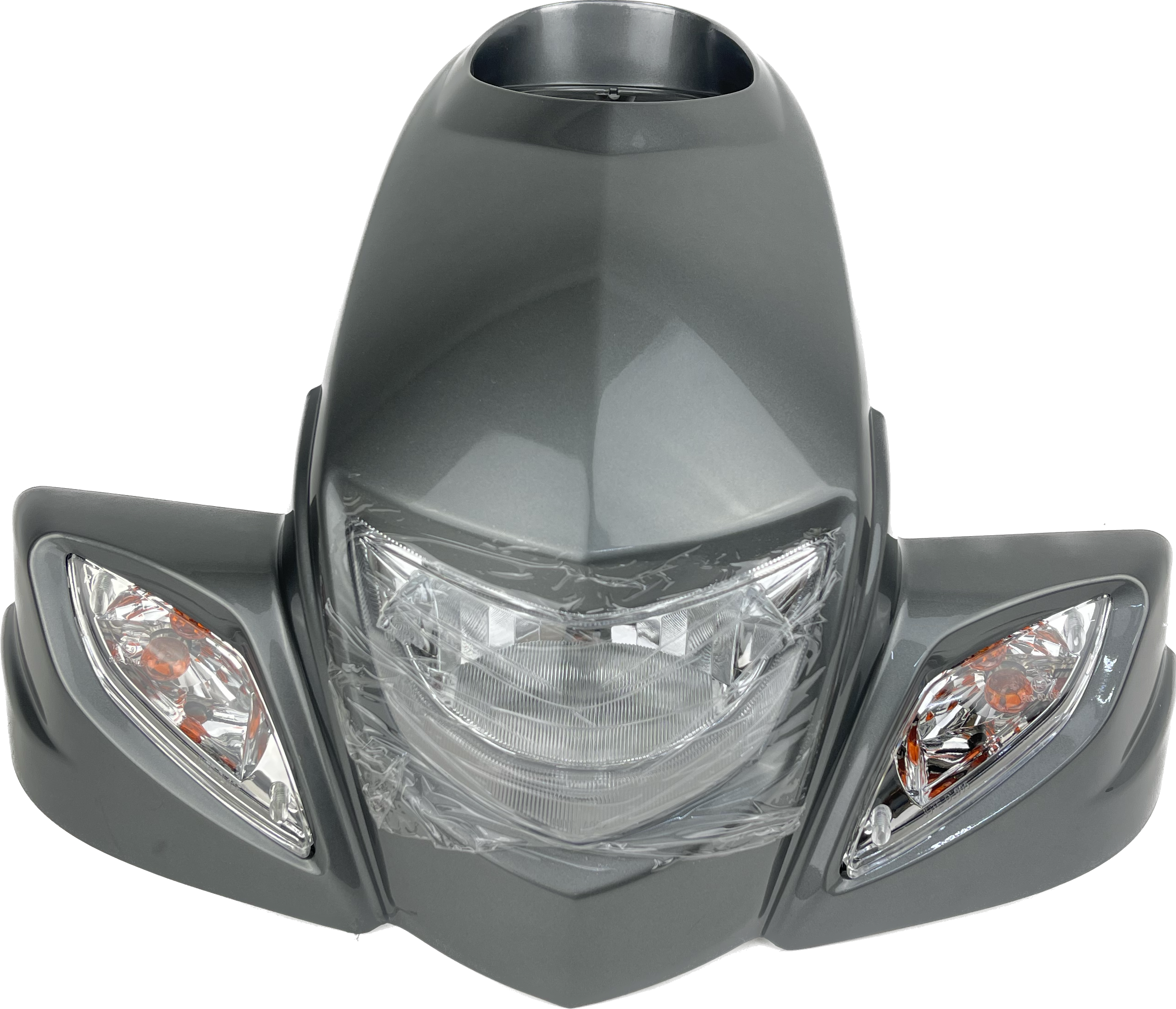 Wij leveren dit voorscherm in de kleur grijs compleet de knipperlichten en de koplamp ook zit de manchet dat tussen de voorkap en de stuurkap inkomt te zitten erbij.