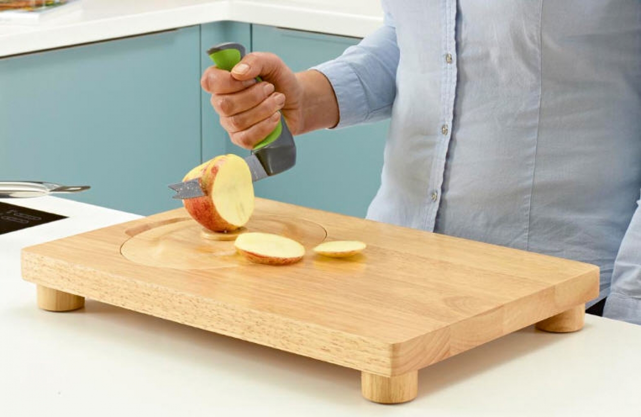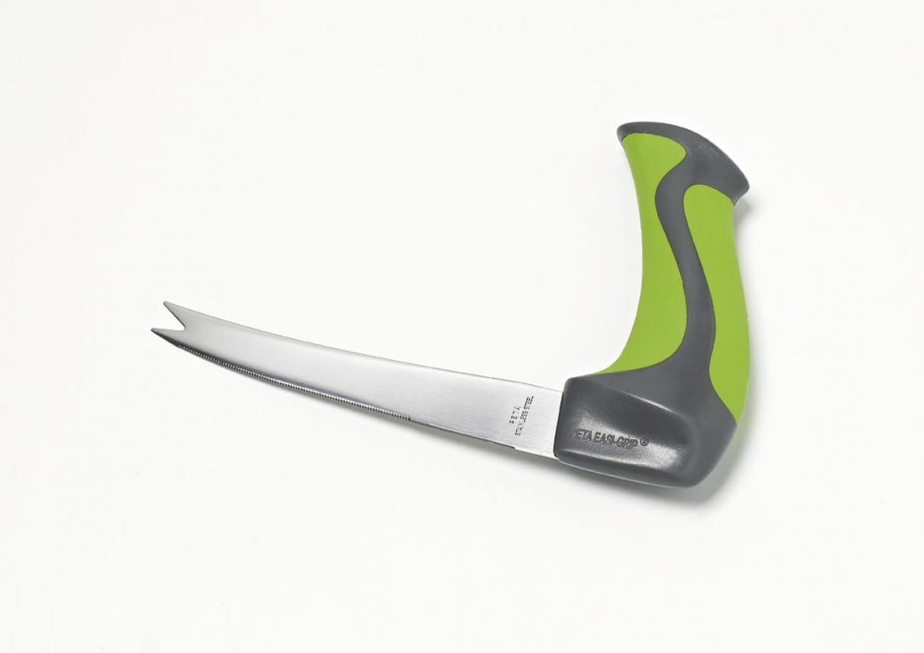 Het gehoekte handvat is dikker gemaakt voor een comfortabele grip. Tevens voozien van een zachte anti-slip. Het mes is voorzien van nieuwe frisse kleuren. Het zachte antislip materiaal is gemarkeerd met een felgroene kleur. De hoek van het handvat is 90° en houdt hand en pols in een natuurlijke positie. Lichtgewicht en het fijn gekartelde mes is van roestvrij staal.