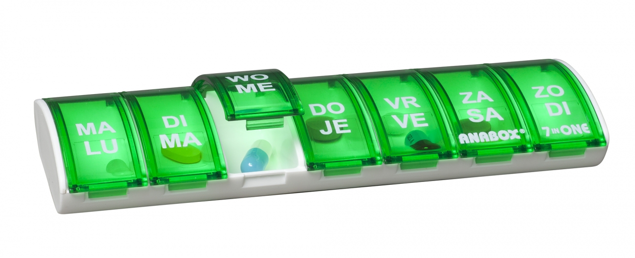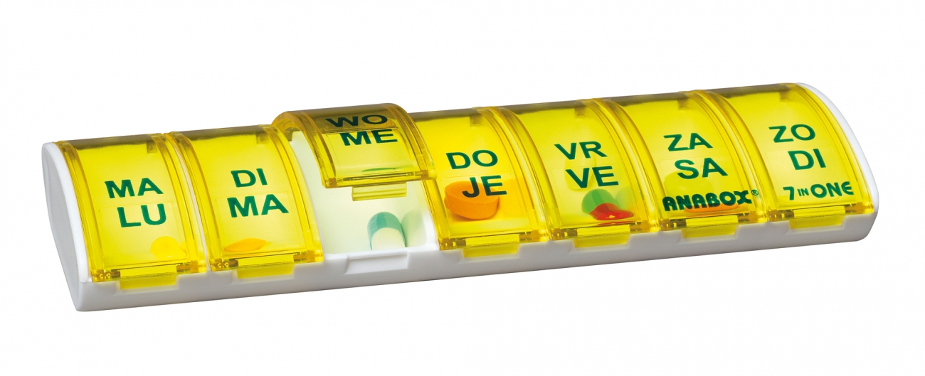 Losse Anabox weekbox. De Anabox weekbox is een box voor 7 dagen met 1 vak per dag. Voorzien van Nederlandstalige en Franstalige tekst.